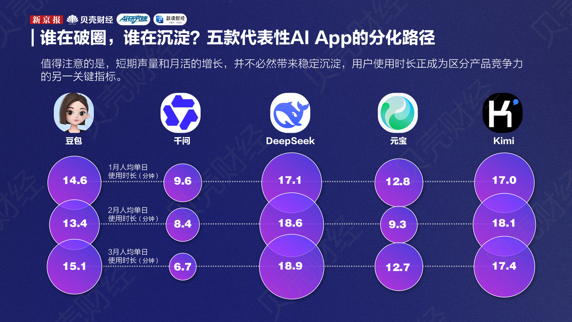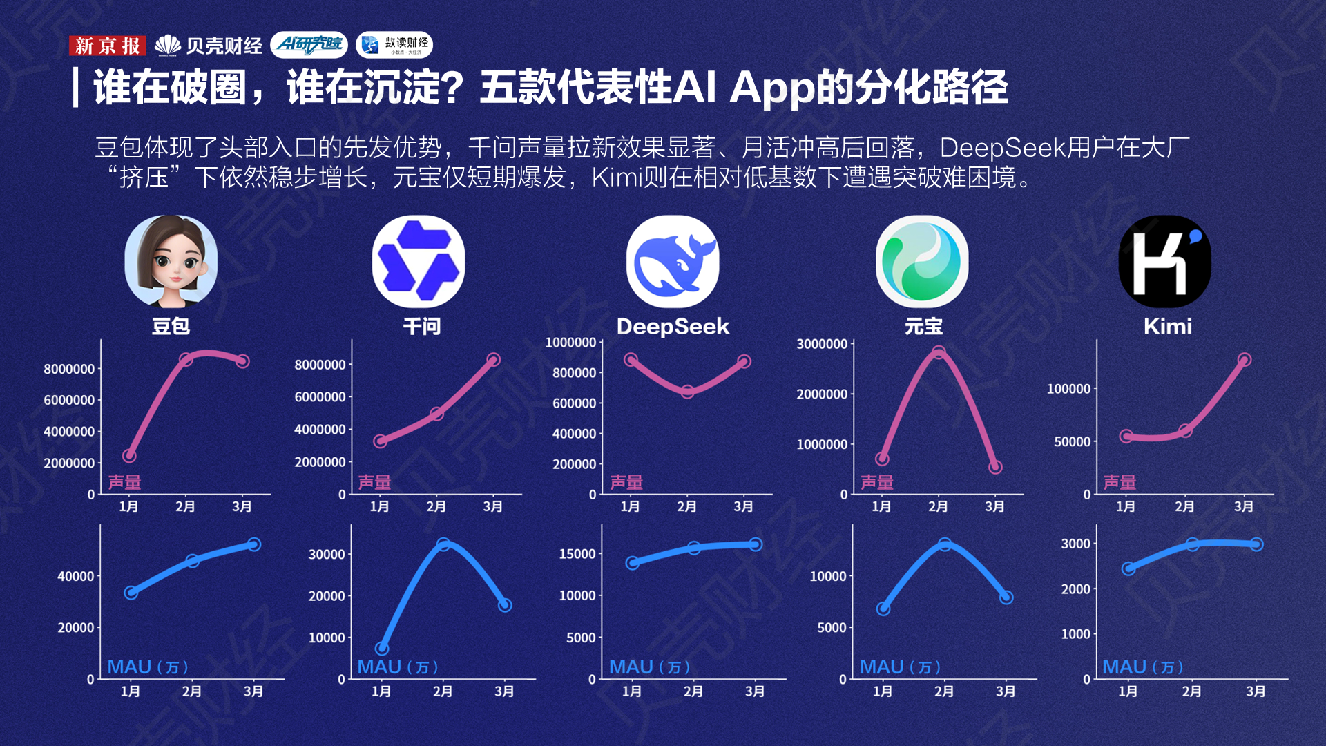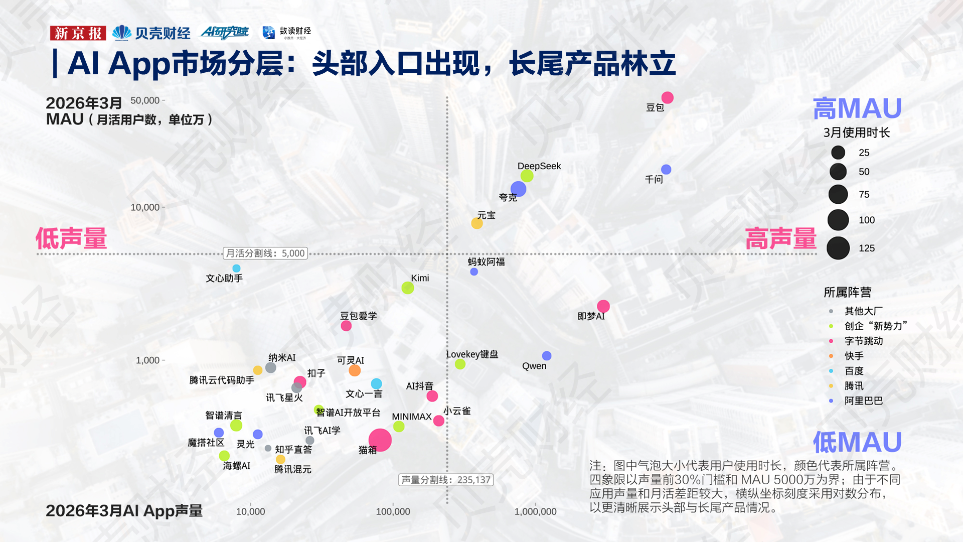 新京报贝壳财经记者梳理2026年3月的中国AI应用声量与月活数据发现,中国AI应用的头部梯队已经初步形成——豆包、千问、DeepSeek、夸克、元宝五款产品在两项指标上都明显领先于其他应用。